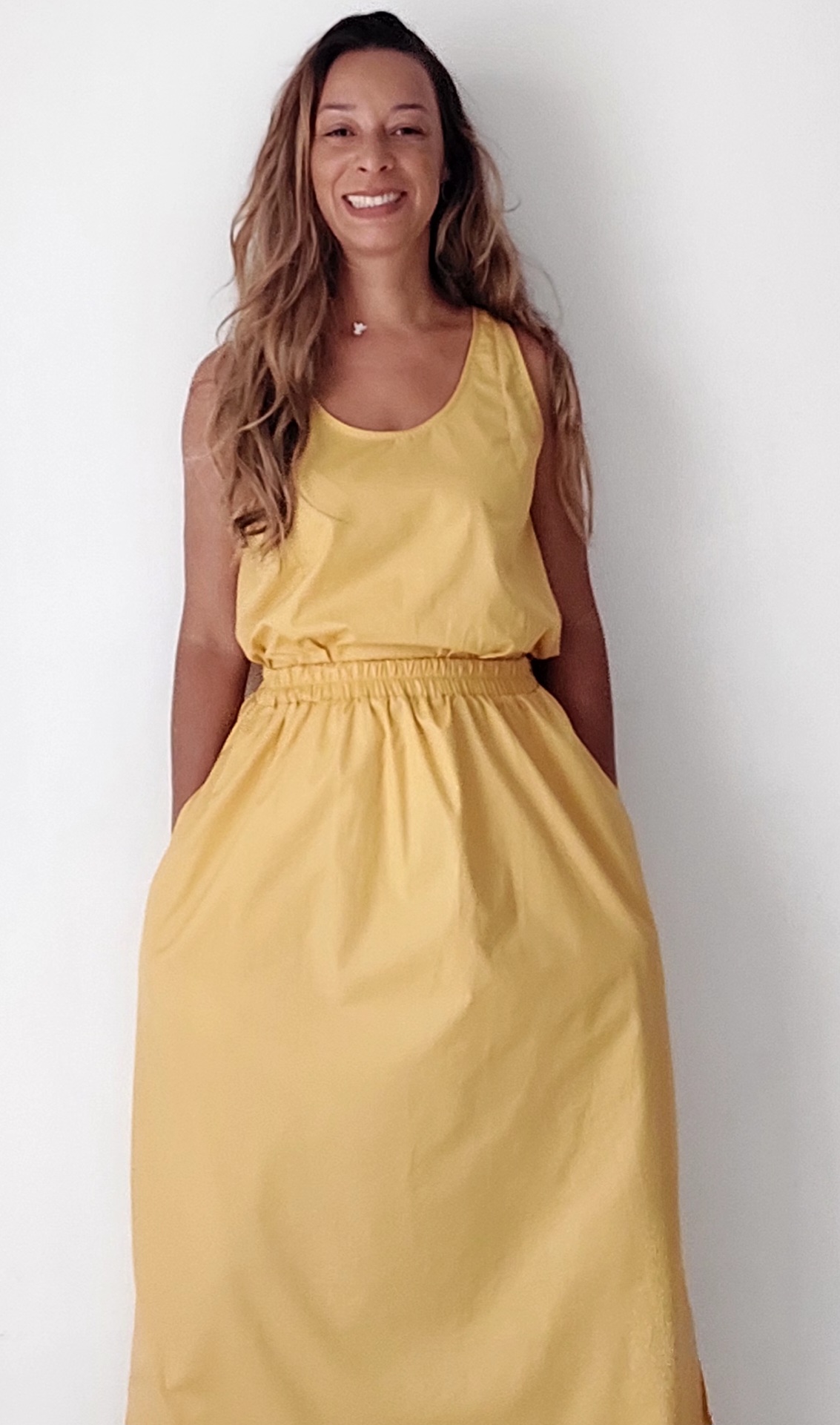 Feita de tricoline 100% algodão, tecido natural, durável e macio ao toque na pele. Possui elástico na cintura e fendas nas laterais.